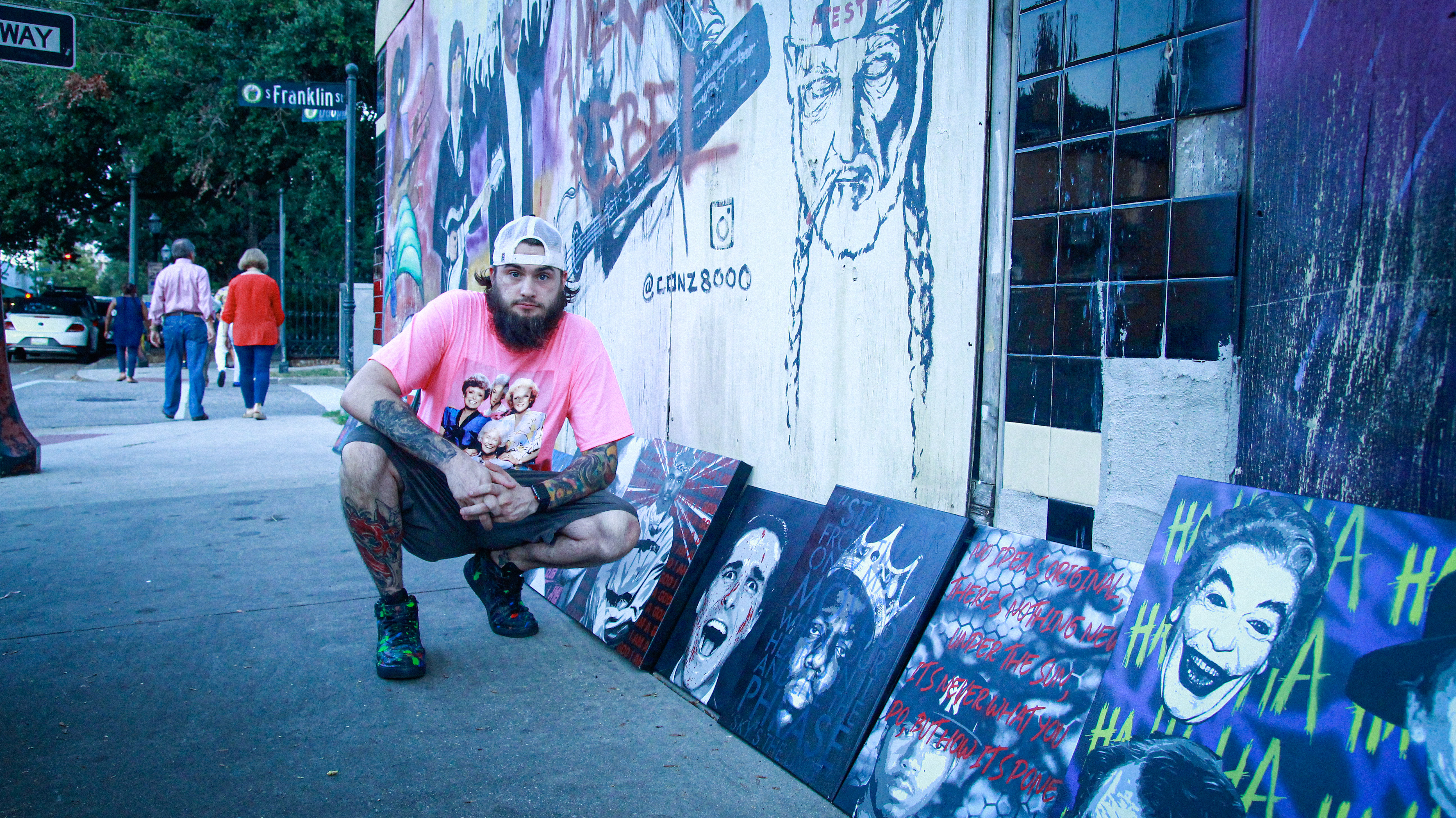 Bowen Flowers, owner of “OG Threads” set up shop with his clothes hanging on a rolling clothing rack outside of “Game Over” bar. He describes Art Walk as a way for artists to be exposed to the city and gives everyone, the youth especially, to see what’s new in their area and to get involved.