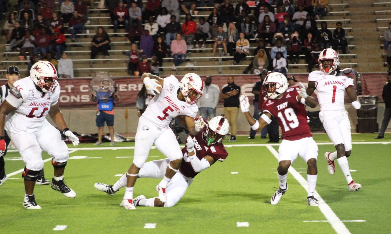 The eighth annual Battle for the Belt rivalry commenced once again between the South Alabama Jaguars and the Troy Trojans. The Jaguars were not having the season that they wanted halfway through the season but there was hope Wednesday night at Troy. Before last night’s game, the home team was 2-5 in this rivalry. The Jaguars played very well offensively to compete through most of the game, but they made too many mistakes on both sides of the ball. The Jaguars were facing a 23-13 deficit when their comeback fell short in the 4th quarter.