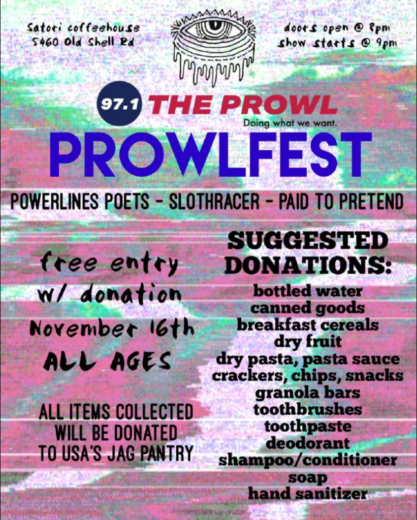 Jag Pantry has partnered with 97.1 the Prowl for their biannual fundraiser Prowlfest on Nov. 16 where they will be hosting a live music and poetry event at Satori Coffee House. The event will be free entry with a donation of canned goods, granola bars, case of bottled water, etc. All donated items will be given back to the Jag Pantry. This is an easy and fun opportunity for college kids to be able to give back to their community on campus.