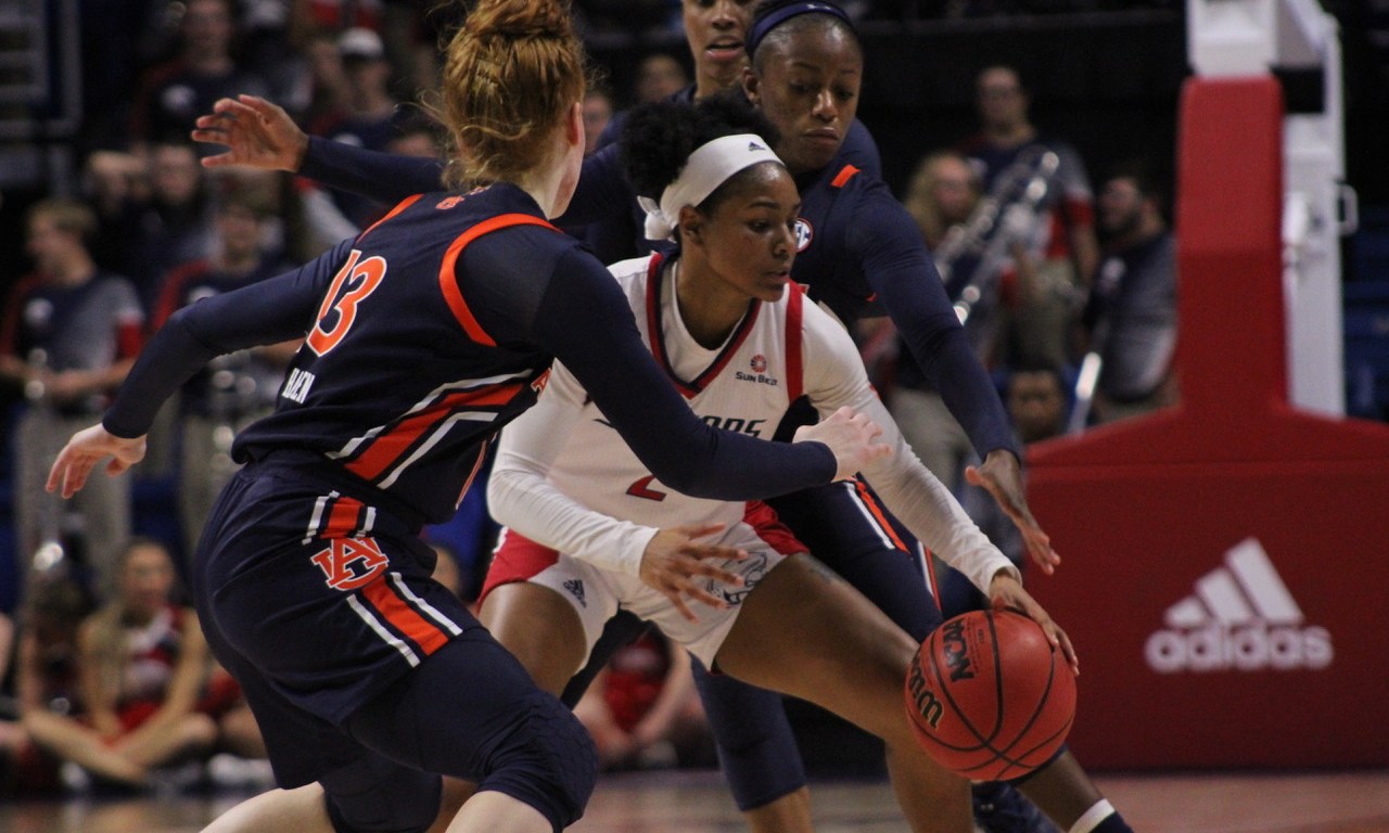On Wednesday, Dec. 4, the South Alabama Jaguars Women’s Basketball Team took on the Auburn Tigers at home, following the historic Men’s game on November 12th. The game was evenly favored between the two women’s teams as they had identical records: three wins and four losses. The last meeting of the teams was in 2010 which resulted in an Auburn 75-70 win. The Jaguars were prepared for the excitement of playing Auburn at home in the Mitchell Center.