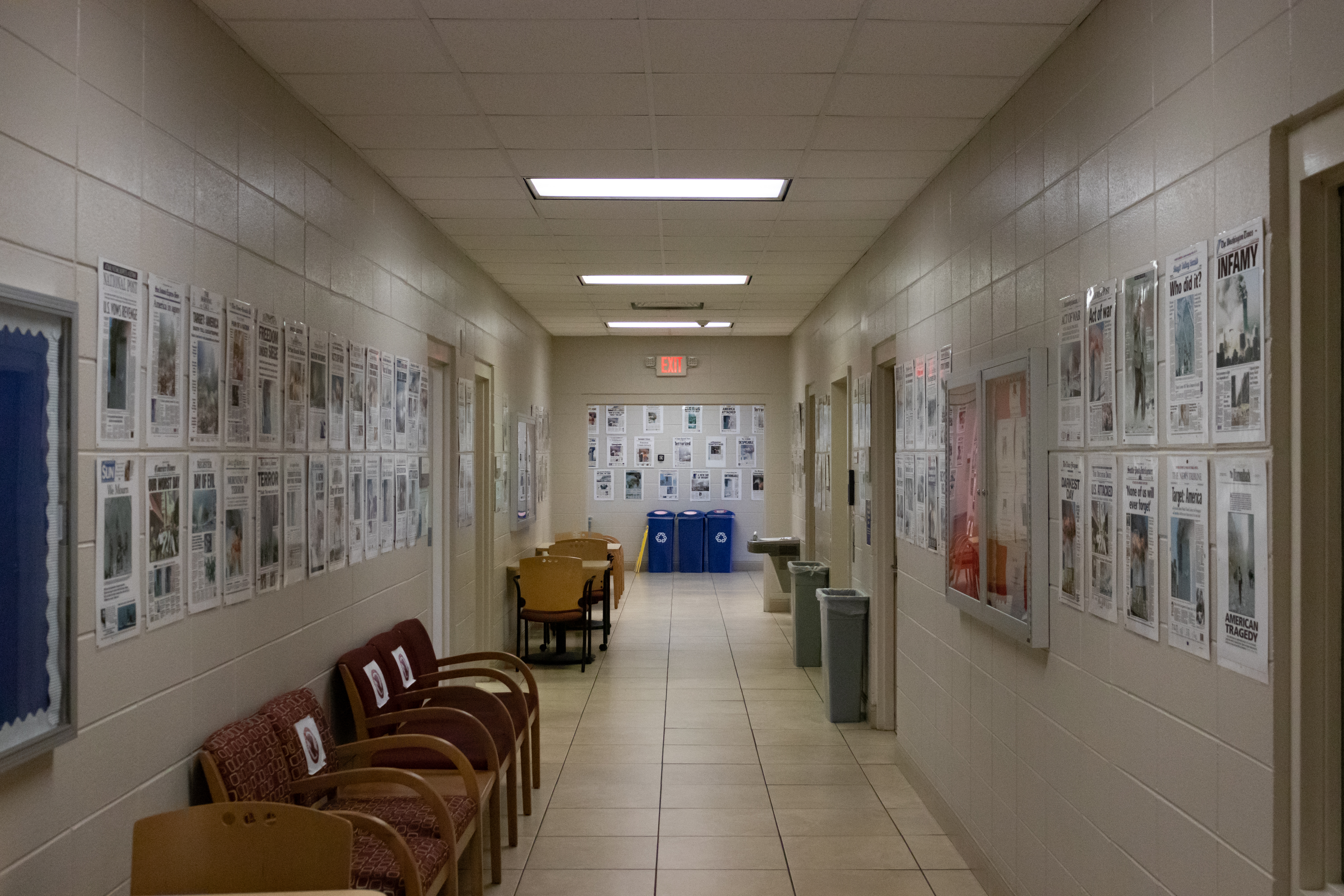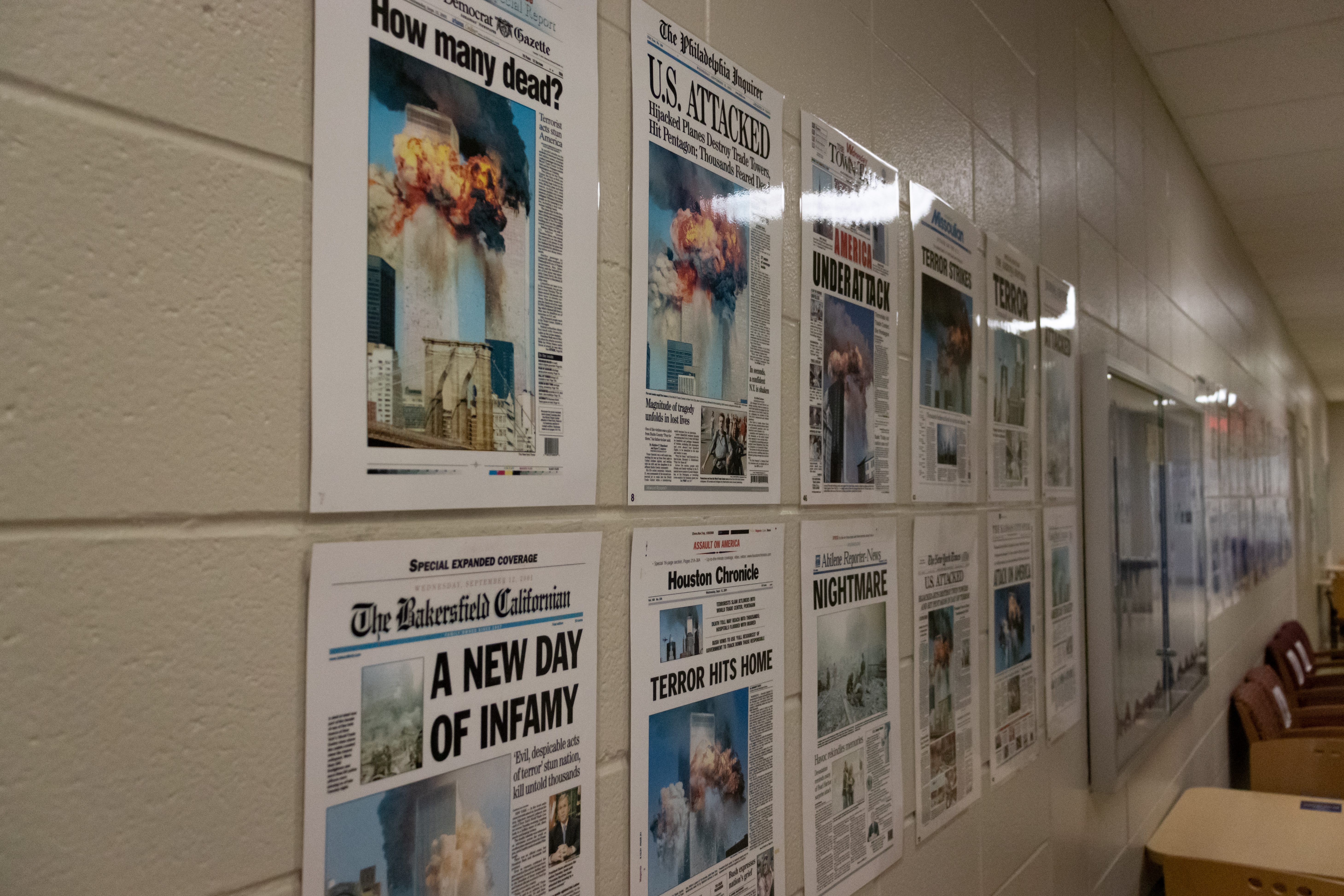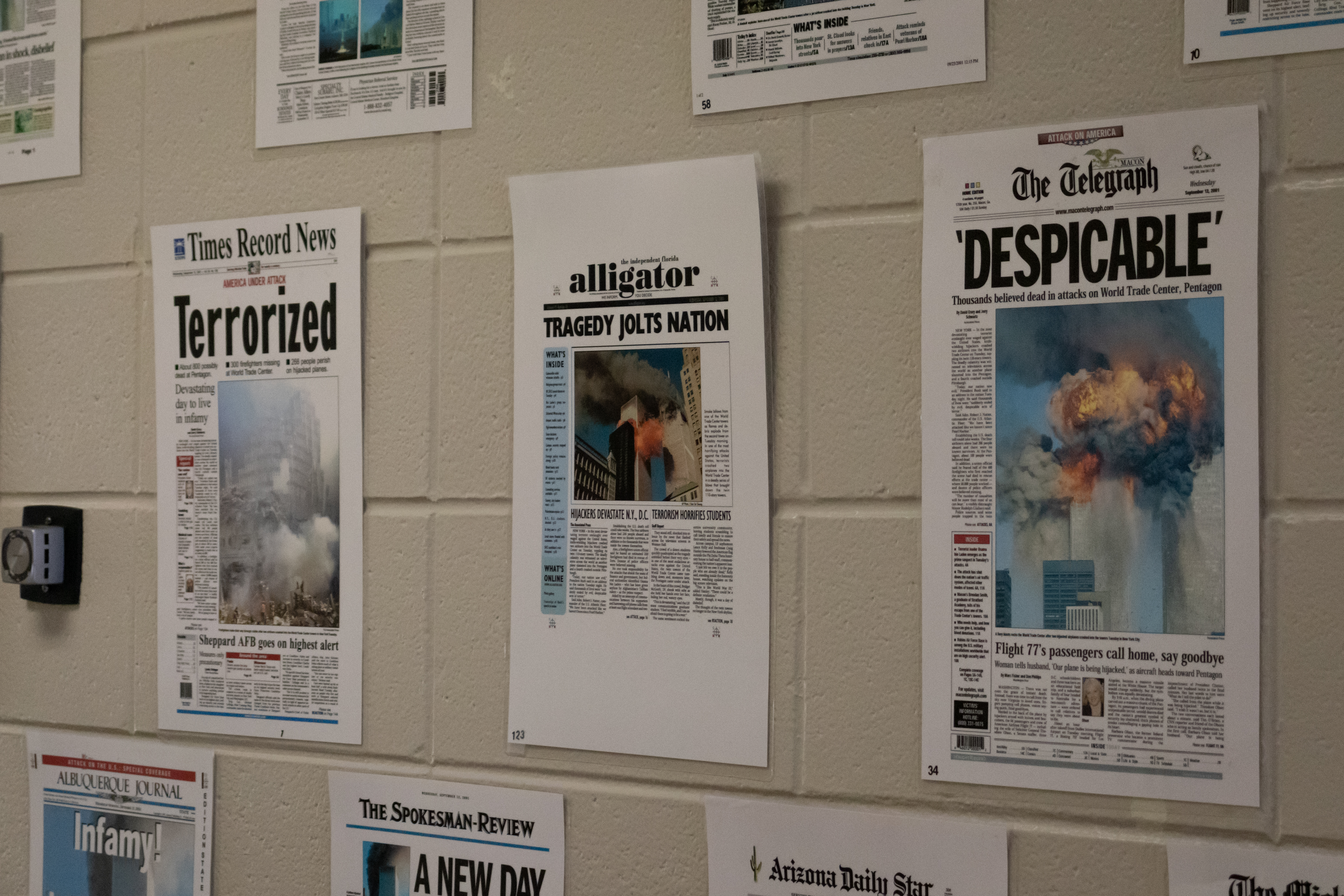 This year, the University of South Alabama set up visible displays in remembrance of September 11. Rows of American flags have been planted in the grass of the Veterans Memorial Plaza outside the Student Center. The Communication department displayed replicas of front pages of newspapers showcasing the disaster across the walls of the first floor.
