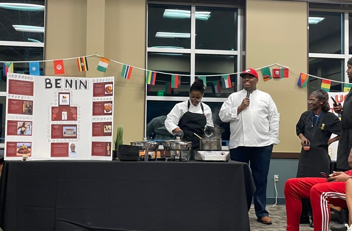Davorius James, Administrative Assistant at the YMCA of Dearborn, Mobile, and former Coordinator of International Student Services and Programs at South, coordinated the Passport To: event with the Head of the Fresh Food Company, Chef Howard Terrance. International students presented their respective countries alongside cooks from the Fresh Food Company. The first Passport To: event was a great success, beginning in Africa on the first day of Black History Month.