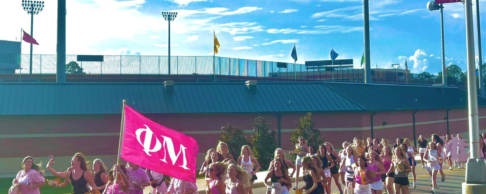The Panhellenic sororities to choose from are Chi Omega, Phi Mu, Alpha Omicron Pi, Alpha Gamma Delta and Kappa Delta. On the second day, an open house allows the rushees to visit all five of the sorority houses on campus.
