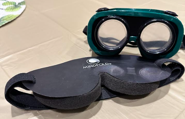 The event was educational and had information tables set up, which allowed participants to try to navigate the world with a visual impairment and use some commonly used devices to live the type of normal that exists for the legally blind. We were offered goggles that changed our vision or blindfolds that removed it entirely. I donned my specially made blindfold, which didn’t even let in light, and tried to use the senses that I rely on a lot less to navigate the world. I signed my name only slightly crooked, counted change with coins by touch (which took forever), tried to understand my name in braille, and even walked a small obstacle course using a white cane and a few verbal cues. I had to lean into trusting the directions of a stranger.