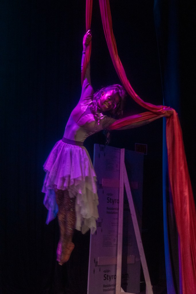 The heart of this play really proved to be the aerial silks, which offered a unique visual experience. This play was many of the actors’ first experience with silks. For example, the character of Charlotte, played by Jada Holmes, performed with the silks throughout the play. The director and actors worked closely with a local aerial silks teacher, Katie Tillman, to learn the silks and prepare for the play.