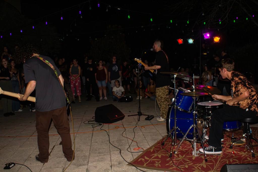 The turnout that night was phenomenal — “the biggest crowd we’ve ever seen,” Cox said. They kicked off their show with their debut single, “Garbageman,” which was also featured on all of their merchandise. Other standout tracks included covers of The Pixies’ “Where Is My Mind,” Radiohead’s “Creep,” and the headbanging, face-melting “Breed” from Nirvana’s “Nevermind” record, which sparked a mini mosh pit of two enthusiastic fans. That night, South Alabama experienced a strong sense of community as residents came together, highlighting the importance of connection and collaboration among individuals in the area. During the performance of “Encapsulate,” attendees used flashlights and vintage lighters to light up the scene. For more information on the Campus Ruckus series and to stay updated on future concerts, be sure to follow Jaguar Productions on Instagram @jpsouthal.