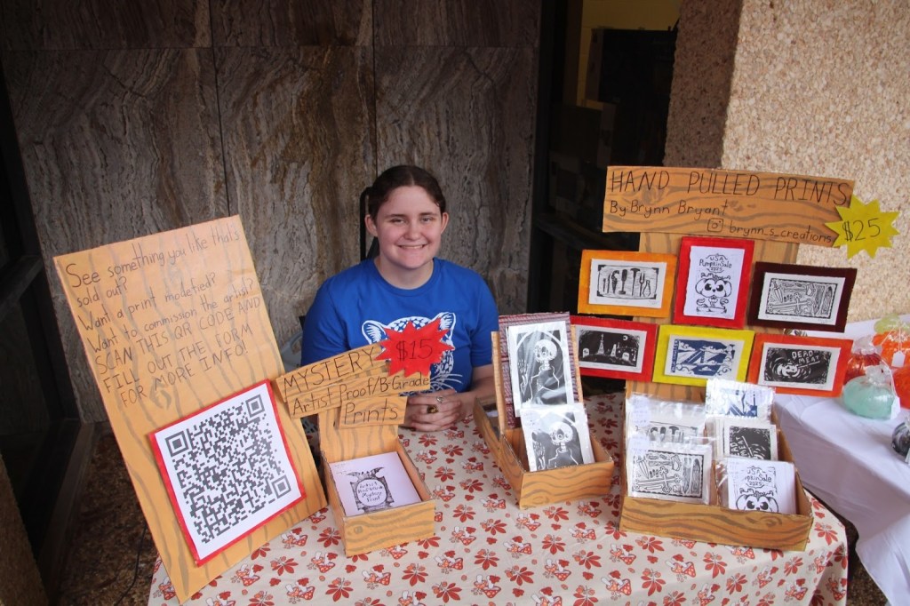 While the main focus of the event is the blown glass, other handmade arts can be featured as well. The sale also featured ceramics, fall-themed clothing, and a student booth. Brynn Bryant, a student majoring in sculpture, set up a booth of her own handmade prints to sell at the pumpkin patch. “A lot of people don’t know that anyone can sell at the pumpkin patch,” she said. You have to get approval from the department, but the event is not only limited to glass pumpkins. Brynn’s linoleum prints are made by carving a design into a block, rolling it in ink, and then transferring it to paper. The booth featured Halloween themed prints, as well as mystery prints that went for fifteen dollars. The prints can be found on her Instagram page, Brynn_S_Creations.