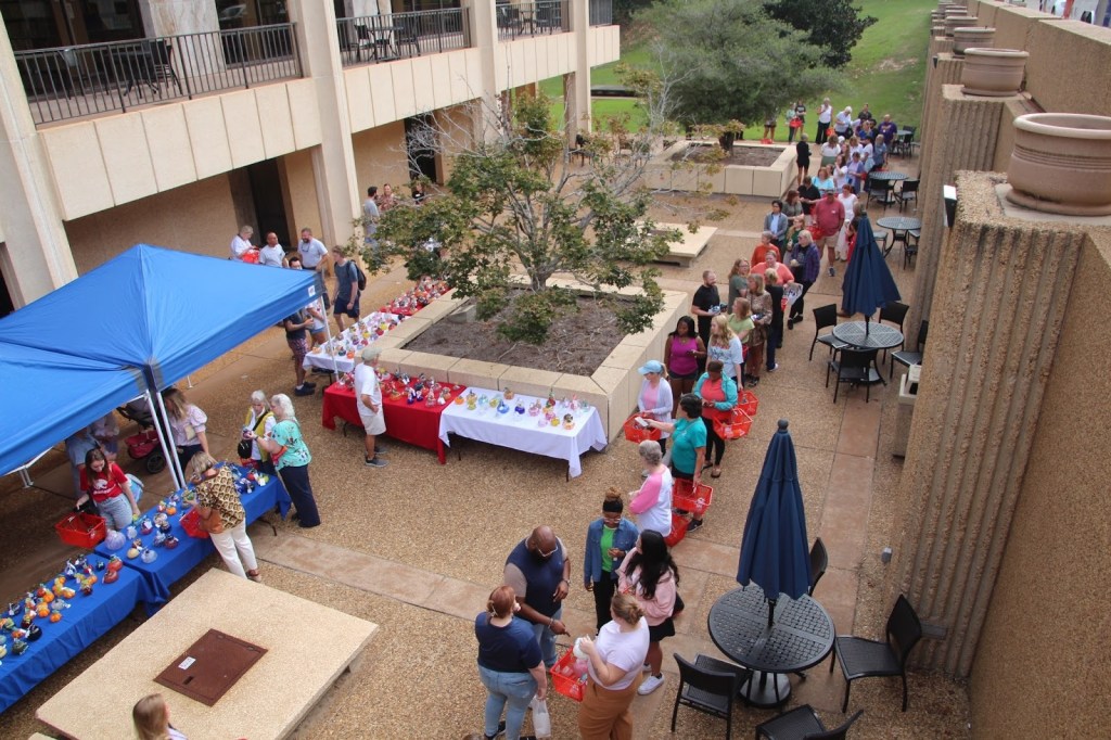 On Friday, October 3, I attended the annual glass pumpkin patch, hosted by the University’s glass-blowing program. The event was organized right outside the Marx Library and featured hundreds of pumpkins, handmade by students, faculty, and alumni. The sale started at 8 am and lasted until 4 pm. By the time I got there, at around 8:30 am, a huge checkout line had already formed, almost wrapping around the corner of the building. I was blown away by the support not only from students, especially that early on a Friday morning, but also from people of all ages. Couples, families, and elders all gathered to shop for these marvelous festive creations. The pumpkin patch serves as a fundraiser for the glass-blowing department here at South. The pumpkins came in a variety of colors, from the classic orange jack-o’-lantern to red, white, and blue pumpkins, representative of our school’s spirit.