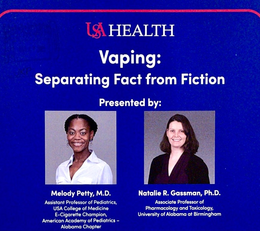 Story and Photo By: Brandon Clark | Contributor | bec2022@jagmail.southalabama.edu Vaping: Separating Fact from Fiction was held in the University of South Alabama’s College of Medicine on Nov. 4 and presented by Melody Petty, M.D, and Natalie R. Gassman, Ph.D. Melody Petty, M.D, is an Assistant Professor of Pediatrics at South Alabama and was recognized by the American Academy of Pediatrics as the E-cigarette Champion. … Continue reading The Dangers of Vaping: Real or Hot Air?